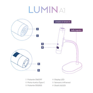Confezione: Lampada UV/Led Lumin A1, base d'appoggio pieghevole, cavo per ricarica USB, manuale istruzioni (in italiano).